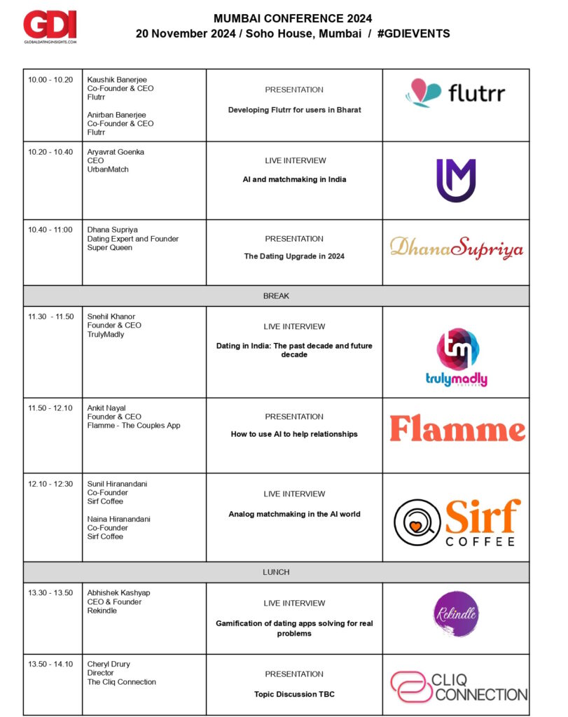 The current lineup of speakers includes the CEOs and Founders of Flutrr, Urbanmatch, TrulyMadly, Flamme, Sirf Coffee, Rekindle and Pure App, alongside the director of the Cliq Connection and dating expert/relationship coach Dahna Supriya. These presentations and talks are set to run throughout the whole day, and will cover a wide range of topics dealing with both Asia-Pacific markets and worldwide aspects of the dating industry.