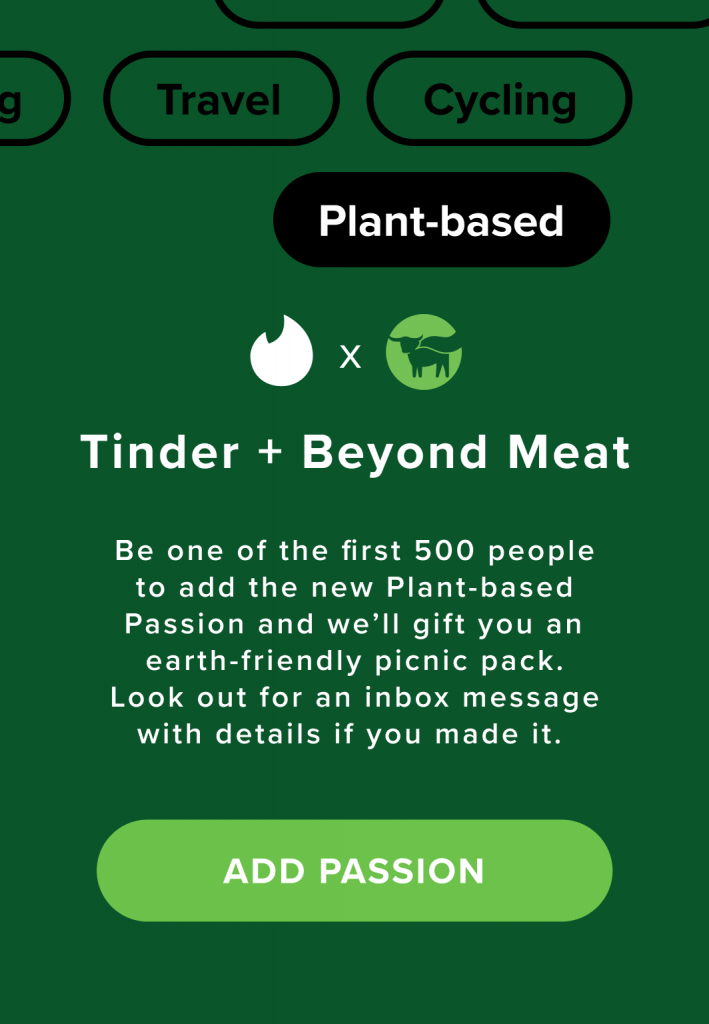 As well as introducing the plant-based Passion, Tinder are also collaborating with leading plant-based meat brand Beyond Meat. The companies are offering 500 singles a ‘date night kit’ and free vouchers for Beyond Meats products.